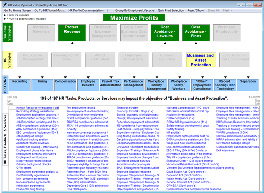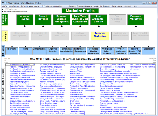 The $trategic HR Management $olutions software is the ideal tool for do-it-yourself, top-down teaching of HR’s impact on the P&L; prioritizing Strategic HR objectives; and choosing which granular HR things should be done to drive the plan.